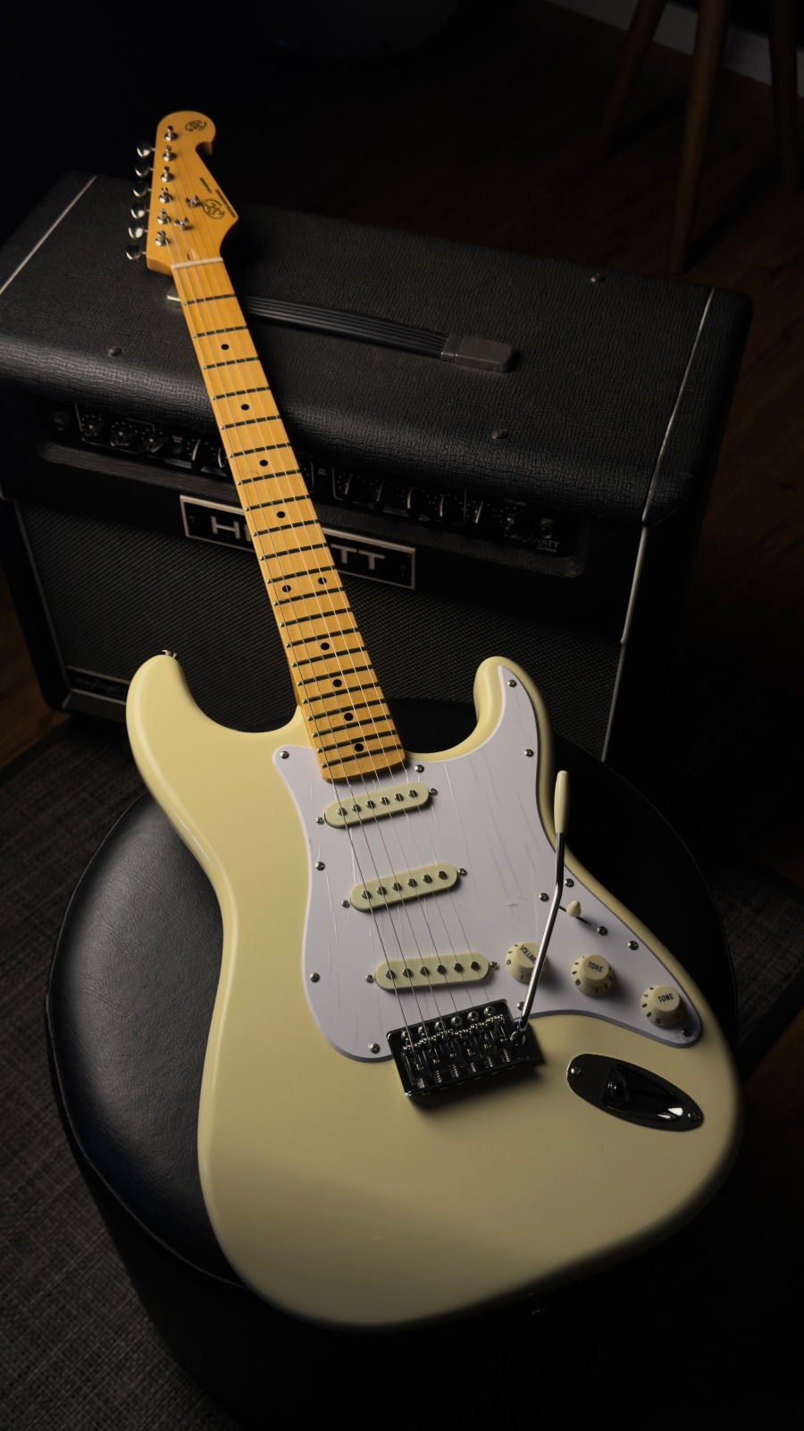 Guitarra com corpo em basswood, braço e escala em maple, ponte standard tremolo e captadores single-coil.